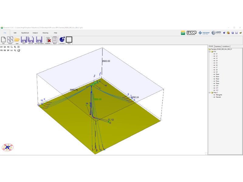 Visando atender a essa demanda da indústria, a Universidade Federal de Alagoas (UFAL), por meio do LCCV (Laboratório de Computação Científica e Visualização), a Universidade de São Paulo (USP), por meio do laboratório TPN (Tanque de Provas Numérico) e a Pontifícia Universidade Católica do Rio de Janeiro (PUC-Rio), por meio do Instituto TecGraf (Tecnologia em Computação Gráfica), vêm desenvolvendo, há mais de 20 anos, o sistema computacional DYNASIM (Fucatu, 1998; Nishimoto et al., 2002), que integra módulos de pré-processamento, análise e pós-processamento, para análise dinâmica não linear no domínio do tempo de plataformas offshore juntamente com os respectivos sistemas de ancoragem e de produção. O sistema DYNASIM já recebeu o CERTIFICADO DE REGISTRO DE PROGRAMA DE COMPUTADOR, Processo BR 51 2014 001550-5, válido por 50 anos, expedido em 08 de março de 2016. O LCCV/UFAL responde pelo módulo de linhas de ancoragem e de produção, disponibilizando o framework DOOLINES (Silveira et al., 2012), que possibilita a análise estática e dinâmica não linear das mesmas, tendo como suporte numérico o clássico Método dos Elementos Finitos (MEF), levando-se em consideração os efeitos de ondas, correntezas, boias, poitas, etc.